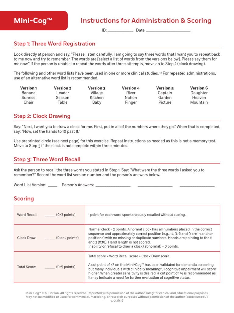 Mini-Cog In Other Languages. Mini-Cog Instructions for Administration Scoring Step 1. Mini-Cog TM Derecho de autor S BorsonPermitido para uso educacional en el AFA National Memory Screening Day en el año 2012.